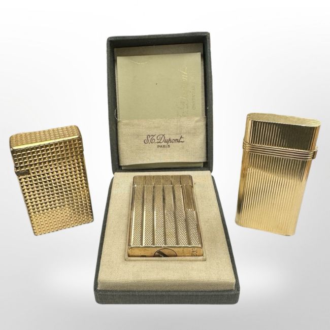 A gold-plated Dupont lighter in box, similar Christian Dior lighter plus another. (3)