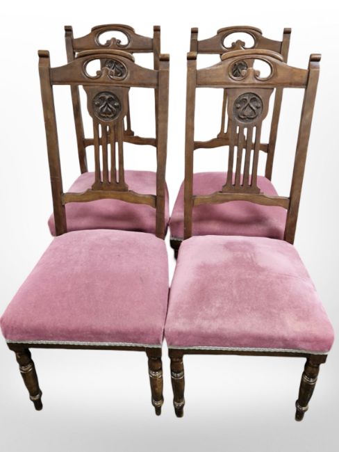 A set of four Edwardian Art Nouveau walnut dining chairs