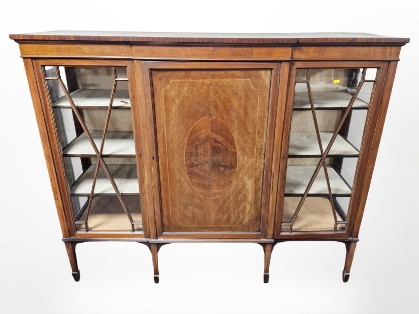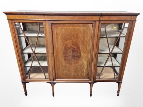 A late Victorian mahogany and satin wood inlaid display cabinet, 152 cm x 41 cm x 128 cm