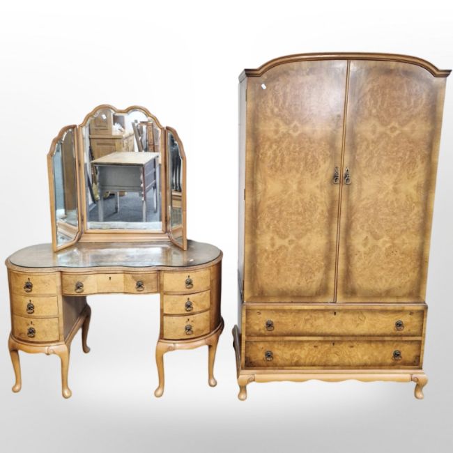 A 20th century figured walnut serpentine mirror back dressing table and matching wardrobe in Queen Anne style