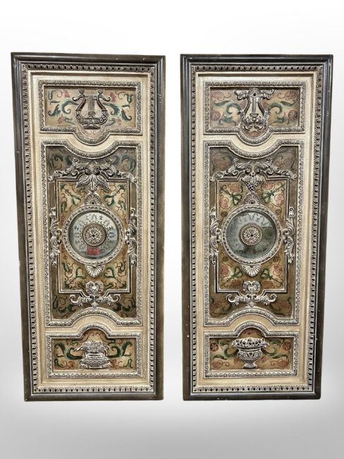A pair of painted carved wooden mirrored panels, each 63cm x 151cm.