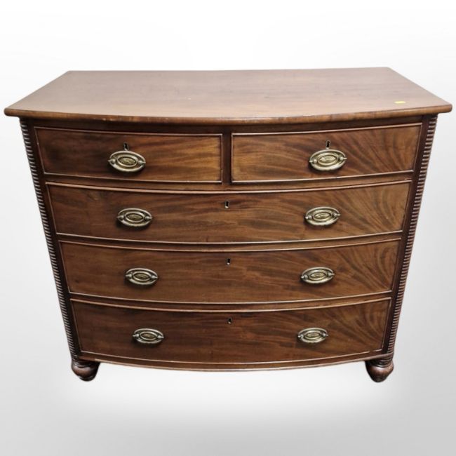 A Victorian mahogany bow-front five drawer chest, 108 cm x 59 cm x 94 cm