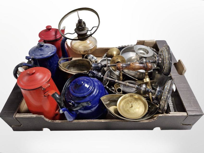 A group of enamelled coffee pots, pair of silver-plated candlesticks, pewter wares, oil lamp base, etc. (1 box)