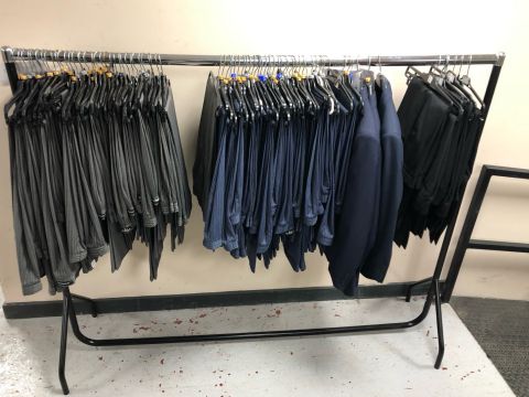 A rail of Gent's navy formal blazers, striped trousers, grey striped trousers and black trousers, various sizes.