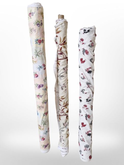 Three rolls of upholsterer's fabric / material, width approximately 140 cm, length unknown.