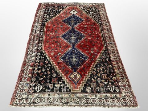 A Kashgai rug, South-West Iran, the three indigo medallions upon a madder central field, the stepped corners typically decorated with stylised flora and fauna, enclosed by cream geometric borders, 244cm by 165cm