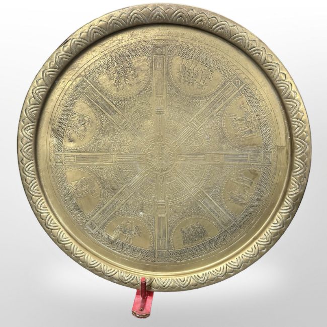 An Egyptian Revival engraved brass charger, diameter 59 cm, together with an associated metal stand