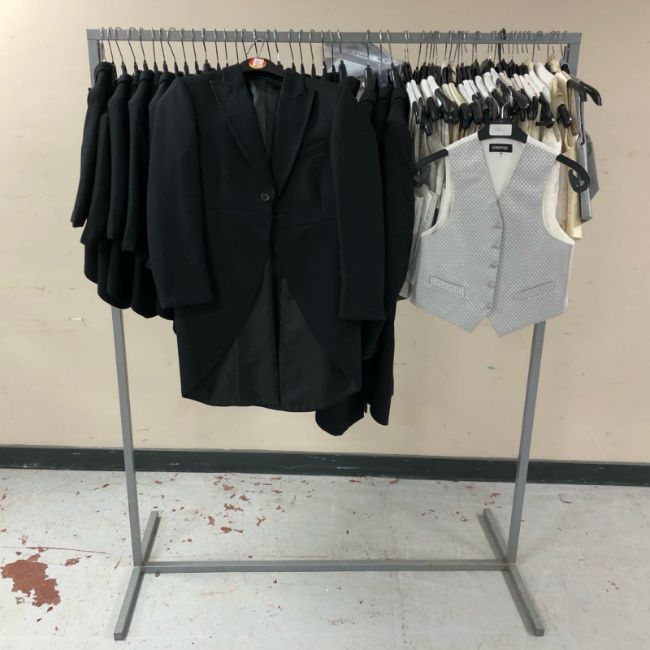 A rail of children's waistcoats and Gent's striped black formal blazers