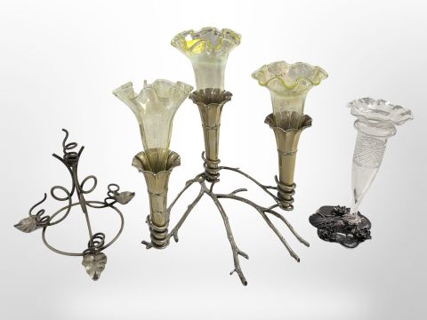 A Victorian silver plated and vaseline glass epergne, height 24 cm together with a clear glass epergne and silver plated stand