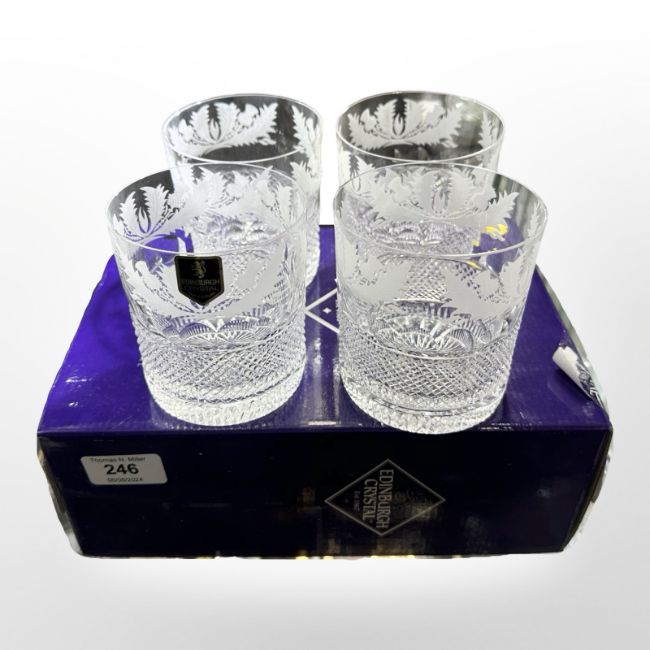A set of four Edinburgh Crystal whisky tumblers etched with thistles, height 9.5cm, boxed.