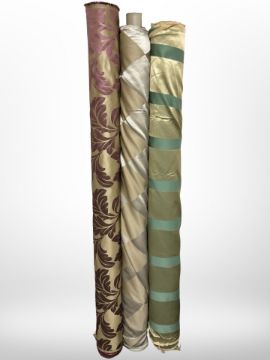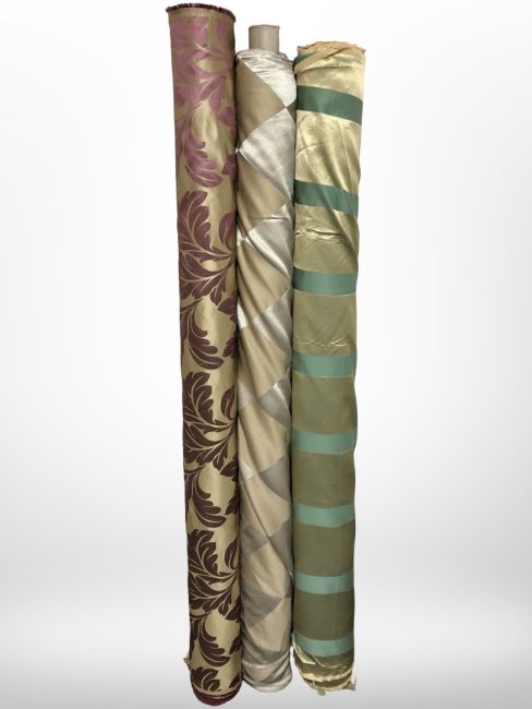 Three rolls of upholsterer's fabric / material, width approximately 140 cm, length unknown.