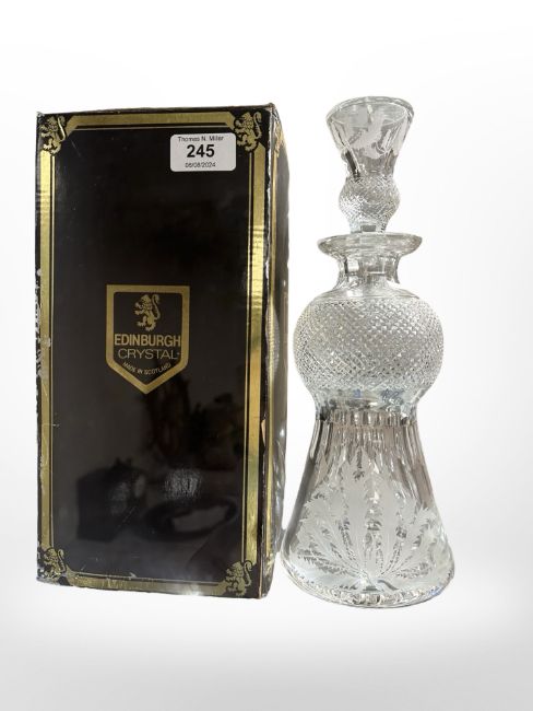 A Edinburgh Crystal decanter and stopper with etched thistles, height 29.5cm, boxed.