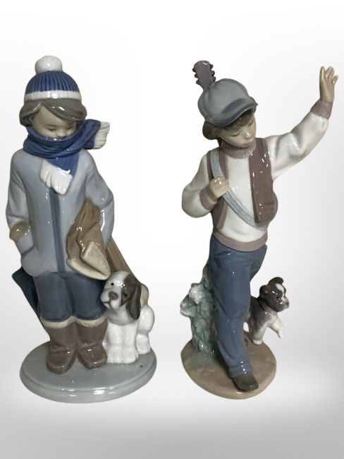 A Lladró figure, 'Wednesday's Child', No. 6015, and a further figure of a boy in winter clothing with a dog at his feet.