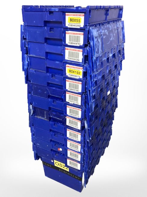 Twelve stackable plastic storage boxes with folding lids, each 60 cm x 40 cm x 36 cm