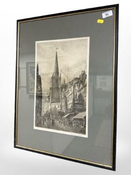 J R Hutchinson (Early 20th century) : High Street, Bristol, etching, 39 cm x 24 cm, framed.
