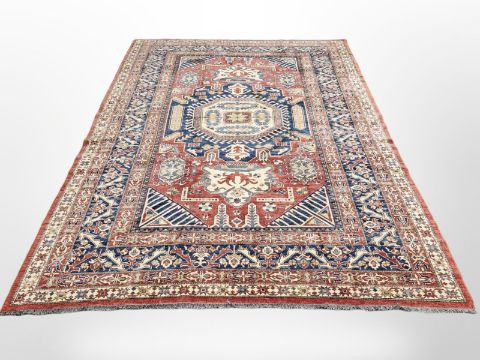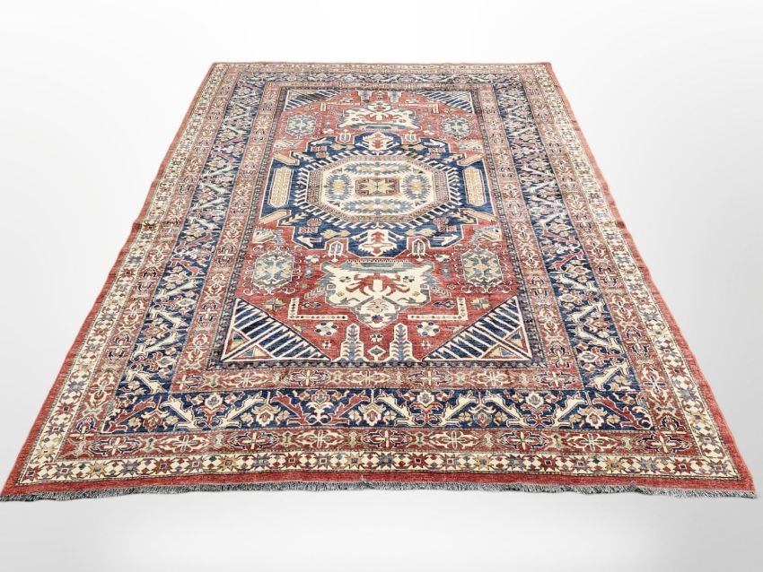 A carpet of East-Caucasian Perepedil design, the large serrated central medallion within an indigo surround, upon a madder field of geometric devices, enclosed by an indigo serrated leaf border and geometric floral guard stripes, 330cm by 251cm.