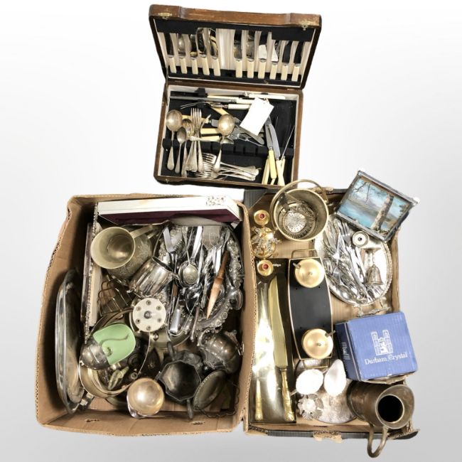 Assorted silver-plated wares including salvers, swing-handled basket, cutlery, tea wares, other brass and copper items, oak canteen of EPNS cutlery, etc. (2 boxes)