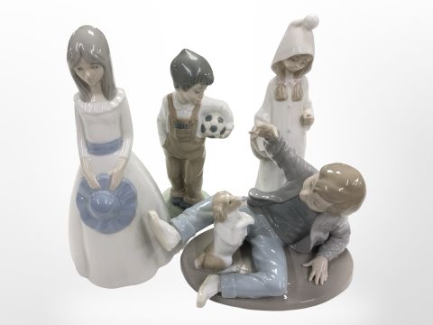 A Lladró figures of a girl, two Nao figures of boys, and a further Spanish figure, tallest 23cm.