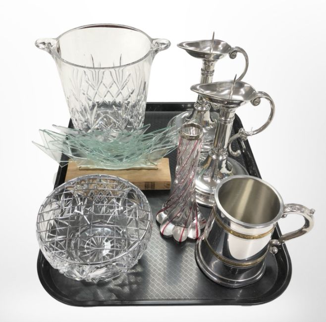 A pair of contemporary silver-plated pricket candlesticks, tankard, glass twist-stem vase with silver rim, Edinburgh Crystal ice bucket, etc.