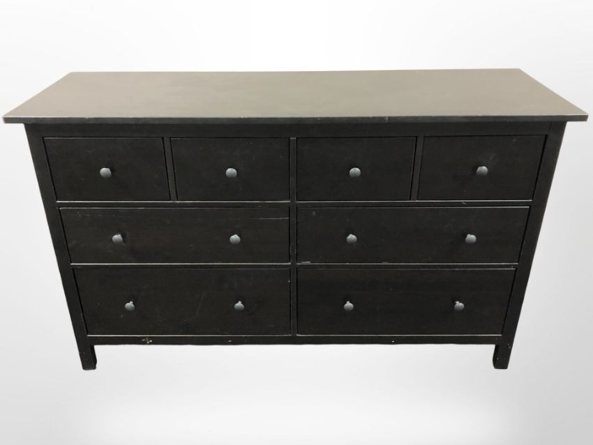 A contemporary stained pine eight drawer chest, width 159 cm x 50 cm deep x 95 cm high