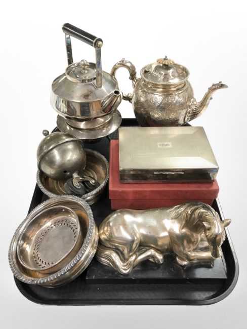 A silver-plated spirit kettle on burner, further teapot, bottle coasters, silvered composition figure of a horse on black marble plinth, etc.