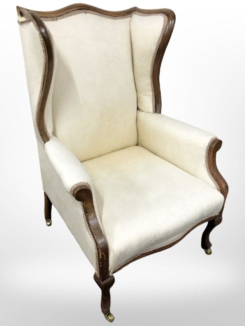 A Victorian mahogany framed wing back armchair in cream floral upholstery on brass castors, width 78 cm