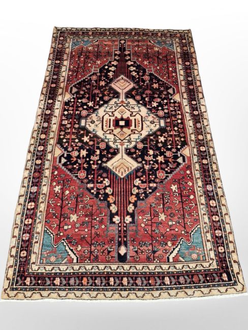 A Hamadan rug, North-West Iran, the cream pole-medallion within an indigo field of stylised floral stems, enclosed by cream and indigo floral guard stripes, 246cm by 144cm.