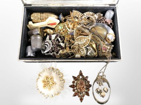 A Japanese silver-plated trinket box containing assorted costume brooches, cufflinks, thimbles, some silver items, etc.