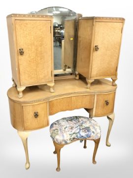 A seven piece birdseye maple bedroom suite comprising of two double door wardrobes, five drawer chest, mirror backed dressing table with stool and pair of bedside cabinets