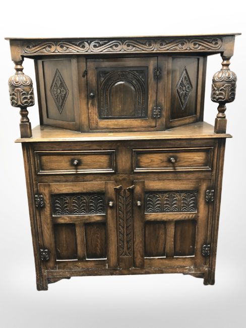 A reproduction carved oak court cupboard, 110 cm x 50 cm deep x 137 cm high