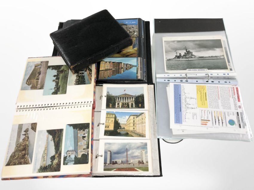 Four albums of 20th-century colour postcards and a further leather-bound photograph album (empty). (1 box)