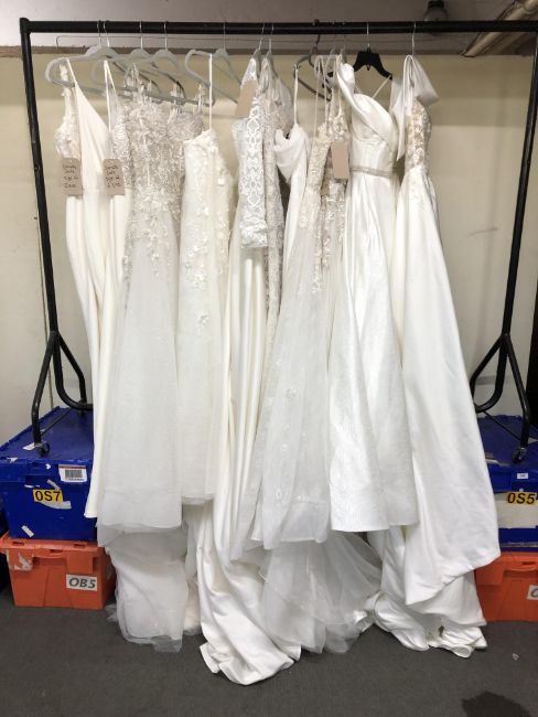 A rail of twelve wedding dresses, sizes 10 - 12, with previous shop retail tags with prices ranging from £200 - £395 each