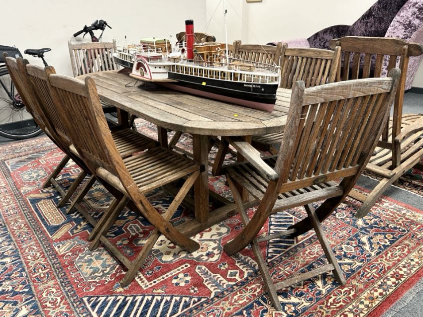 A plantation teak garden table, 90cm x 191cm, together with a set of eight folding chairs comprising of six singles and two armchairs.