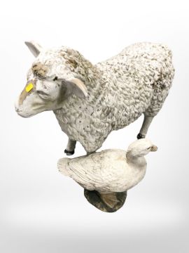 A plastic figure of a sheep and a duck, largest 81 cm