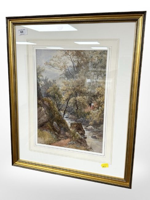 Nineteenth century School : Figures by a bridge, watercolour, indistinctly signed, 24 cm x 34 cm