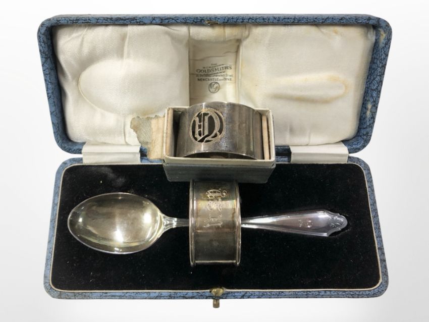 A cased silver spoon and napkin ring plus a further napkin ring.