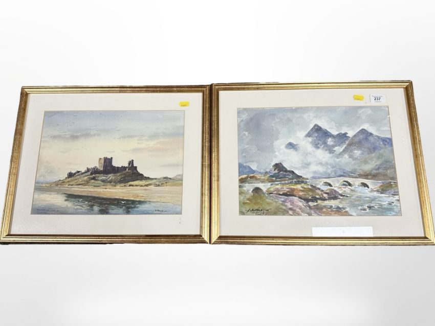 William Fergie (British, 1893-1971) Bamburgh Castle, watercolour, together with a J K Maxton watercolour of a river with mountains beyond on the Isle of Skye. (2)