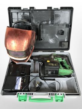 A Hitachi drill in box, together with a welding mask.