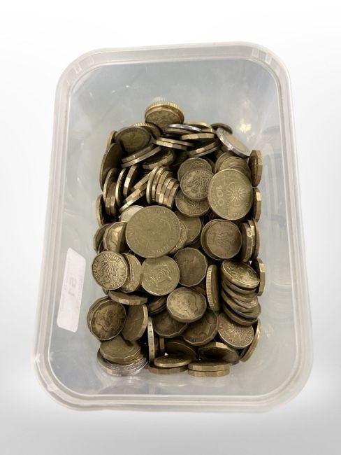 A tub containing a collection of nickel-brass coins, in the main threepence bits and others, weight approximately 1.9 kg.
