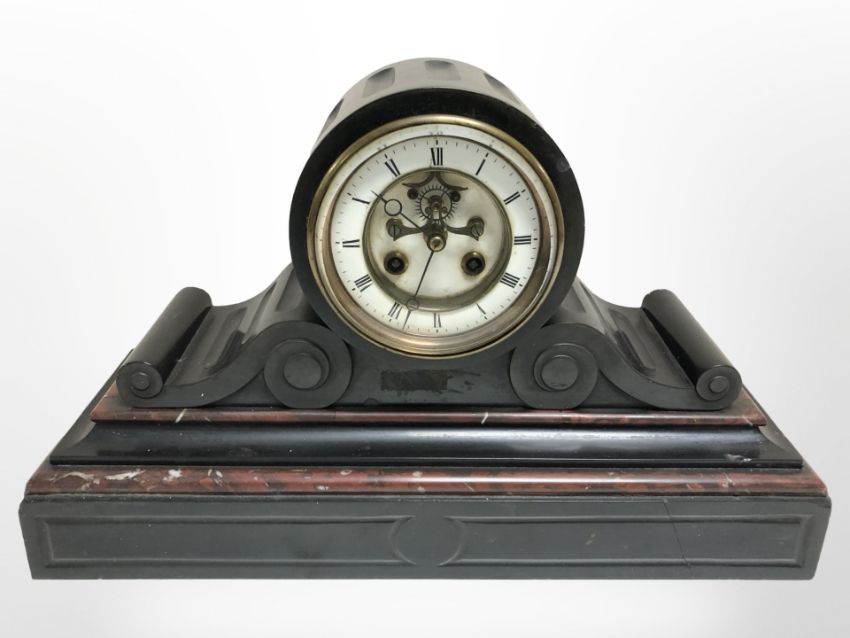 A Victorian black slate and rouge marble drum head mantle clock, the enamelled dial with visible deadbeat escapement, width 40cm, with key.