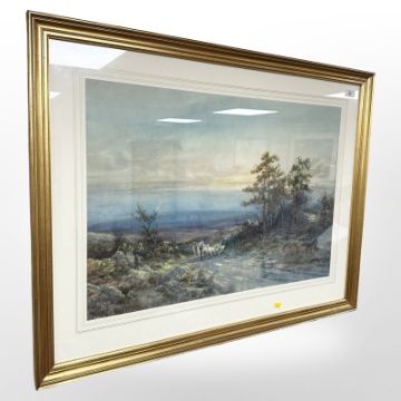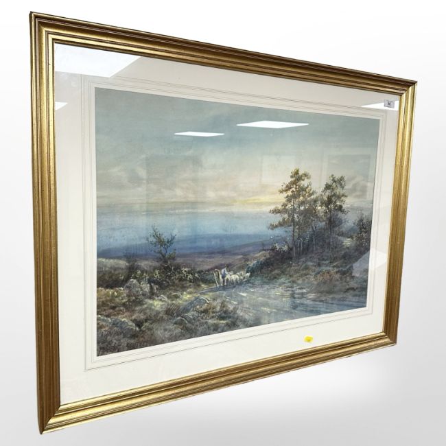 Rubens A J N Southey (British, 1881-1933) : Dartmoor Landscape with Shepherd and Sheep, watercolour, signed, 50 cm x 72 cm, framed.