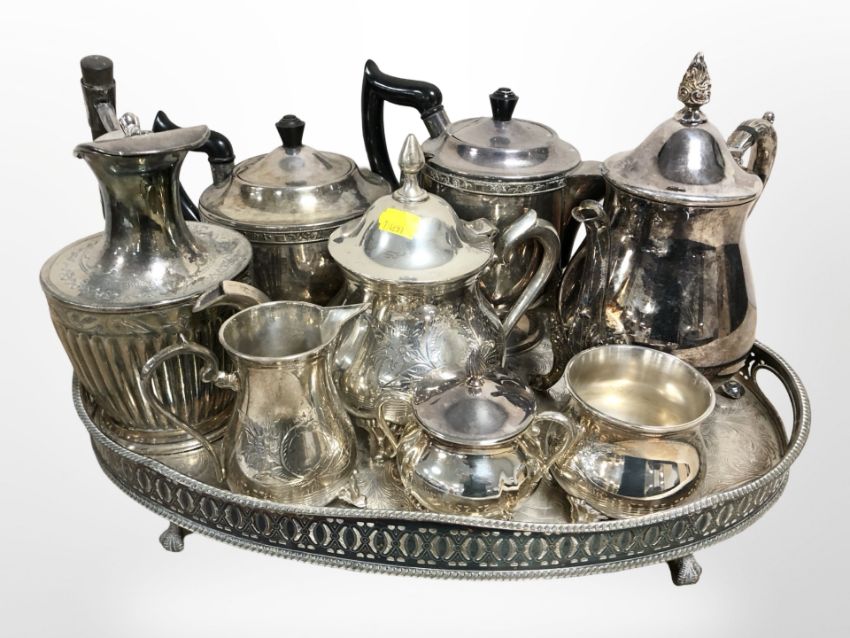 A silver-plated gallery tray containing assorted tea wares.