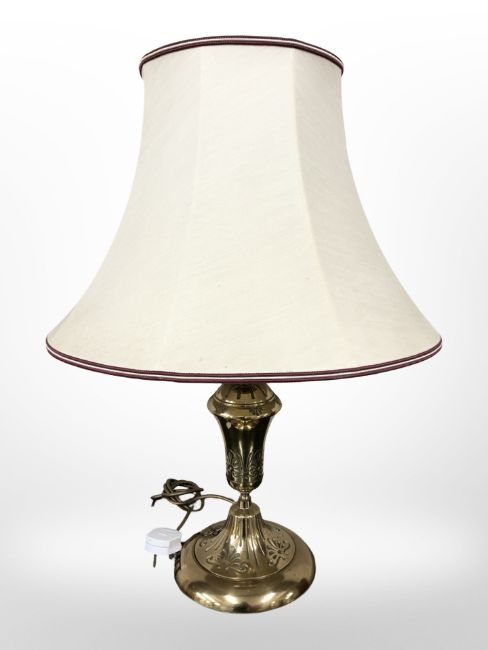 A brass table lamp with shade, height 63 cm