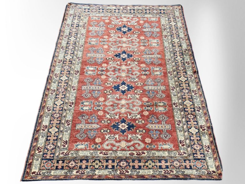 A rug of East-Caucasian Perepedil design, the central column of four serrated indigo medallions separated by stylised ram's horn motifs against a madder ground, enclosed by an indigo geometric border and cream guard stripes, 200cm by 151cm
