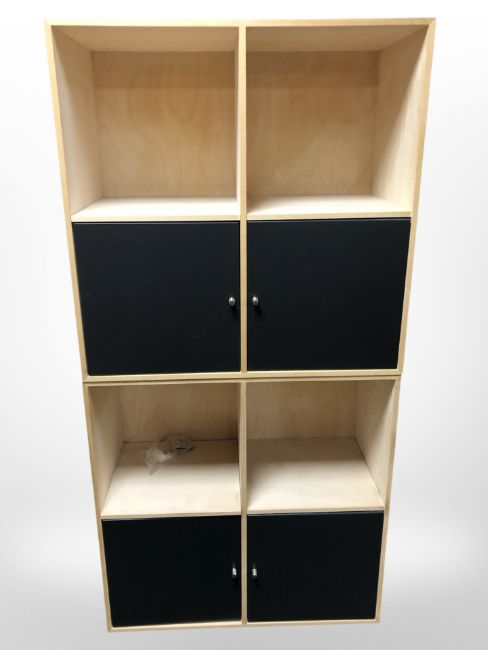 A pair of contemporary ply-wood cube shelves, each 70 cm wide