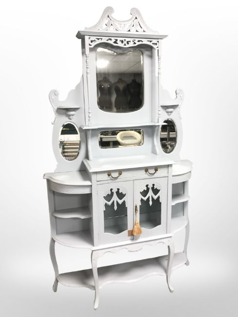 A painted Victorian mirror backed display cabinet, 125 cm x 35 cm x 212 cm