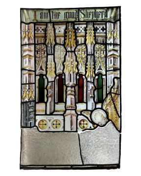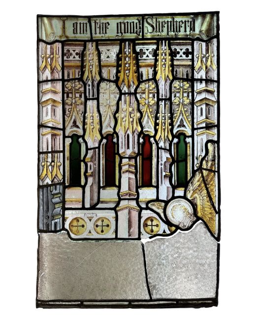 A stained glass panel, John 10:14 - I Am the Good Shepherd, the verse above Gothic architectural columns, a winged angel lower-right and plain oblong panes beneath, 98cm by 61cm. * Provenance : The Porch/Vestibule Window of Burn Park Road Methodist Church, Sunderland (known previously as Thornhill Methodist Church), built 1902-1903 by TR Millburn and JE Miller. The Millburns also built the Empire Theatre in Sunderland. The windows were designed by Atkinson Brothers of Newcastle Upon Tyne. William, Frederick and Albert Atkinson started their business at 125 New Bridge Street, Newcastle upon Tyne in 1876. William died in 1890, and the others continued in business. A large amount of their work involved memorial windows after World War One. Frederick died in 1927 and Albert sold the business to Reed Millican in the early 1930s. These panels were manufactured by Hartley Wood & Co Glass Works in Sunderland, using the Atkinson designs.