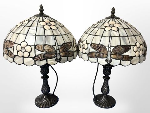 A pair of Tiffany-style patinated metal table lamps with dragonfly shades, height 45cm.