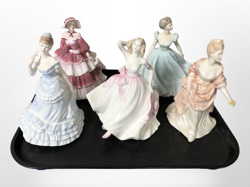 Five Coalport porcelain ladies to include 'Daphne', 'Rapture', 'Invitation', Young Love', and 'Donna'.