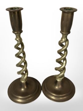 A pair of Victorian barley-twist brass candlesticks, height 25cm.